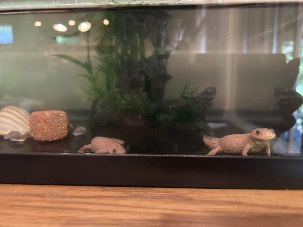 一匹は岩によじ登って顔を半分だしたままボーっとするのが好きな様子。も一匹は呼吸のために、口を一瞬出す以外は水の中にずっといる。